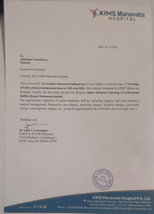 Vaibhav Gaikwad Master Vaibhav Hanumant Gaikwad – Case No. 337 – Suffering from Tetrology of Fallot, Atresia Membranous which was done in May. He has been advised surgical ballon dilatation/stenting of Unifocalised MAPCA/Branch Pulmonary Arteries. Please support him for his Open Heart Surgery and post surgical management, supportive care and medicine charges.