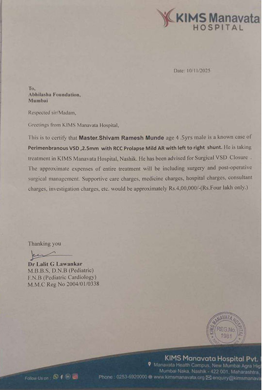 Shivam Munde Master Shivam Ramesh Munde – Case No. 333 – Suffering from Semimembranosus VSD with RCC Prolapse Mild AR with left to right shunt. Please support him for his Open Heart Surgery and post surgical management, supportive care and medicine charges.